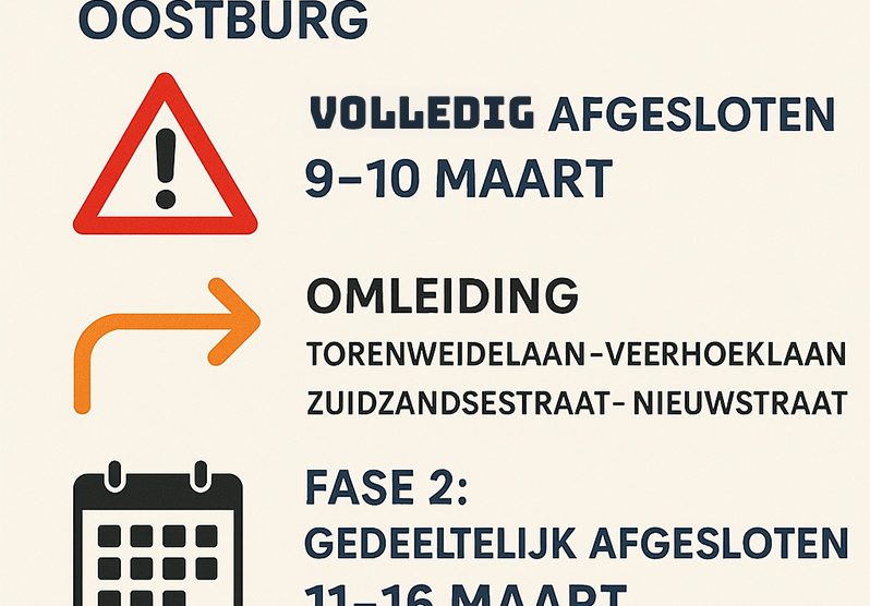 Let op: op maandag 9 en dinsdag 10 maart is de weg volledig afgesloten vanwege een wegdoorsteek. De afsluiting geldt ook buiten werktijden. Verkeer wordt omgeleid via de Torenweidelaan, Veerhoeklaan, Zuidzandsestraat en Nieuwstraat.